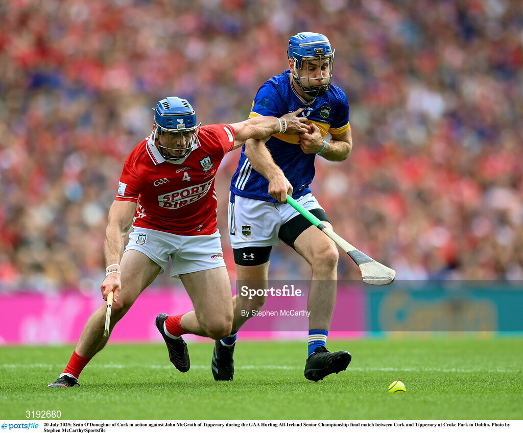 20 July 2025; Seán O'Donoghue of Cork in action against John McGrath of Tipperary during the GAA Hurling All-Ireland Senior Championship final match between Cork and Tipperary at Croke Park in Dublin. Photo by Stephen McCarthy/Sportsfile