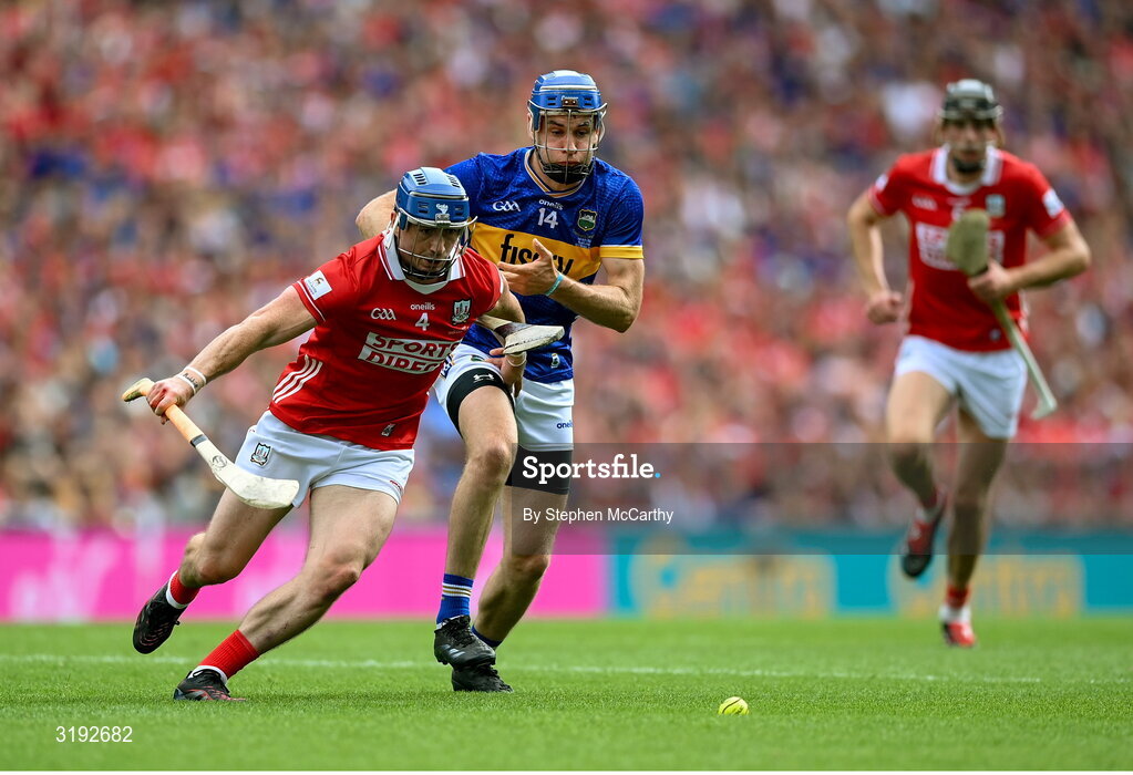 20 July 2025; Seán O'Donoghue of Cork in action against John McGrath of Tipperary during the GAA Hurling All-Ireland Senior Championship final match between Cork and Tipperary at Croke Park in Dublin. Photo by Stephen McCarthy/Sportsfile