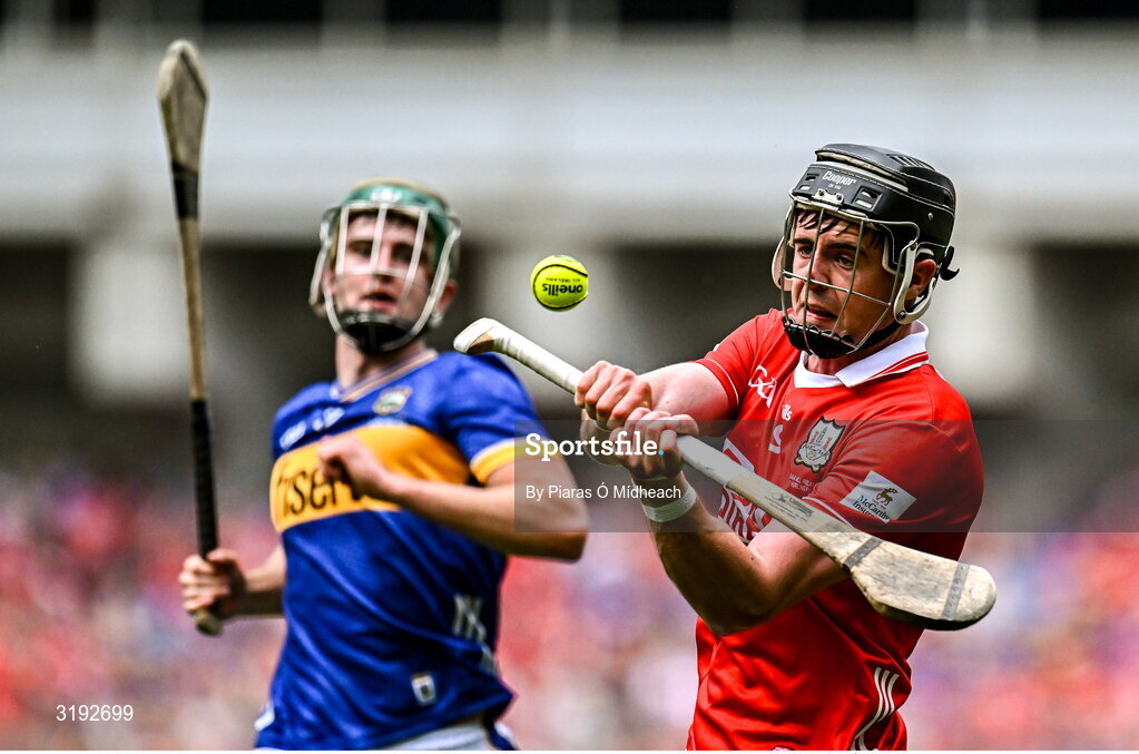 20 July 2025; Darragh Fitzgibbon of Cork shoots under pressure from Sam O’Farrell of Tipperary during the GAA Hurling All-Ireland Senior Championship final match between Cork and Tipperary at Croke Park in Dublin. Photo by Piaras Ó Mídheach/Sportsfile
