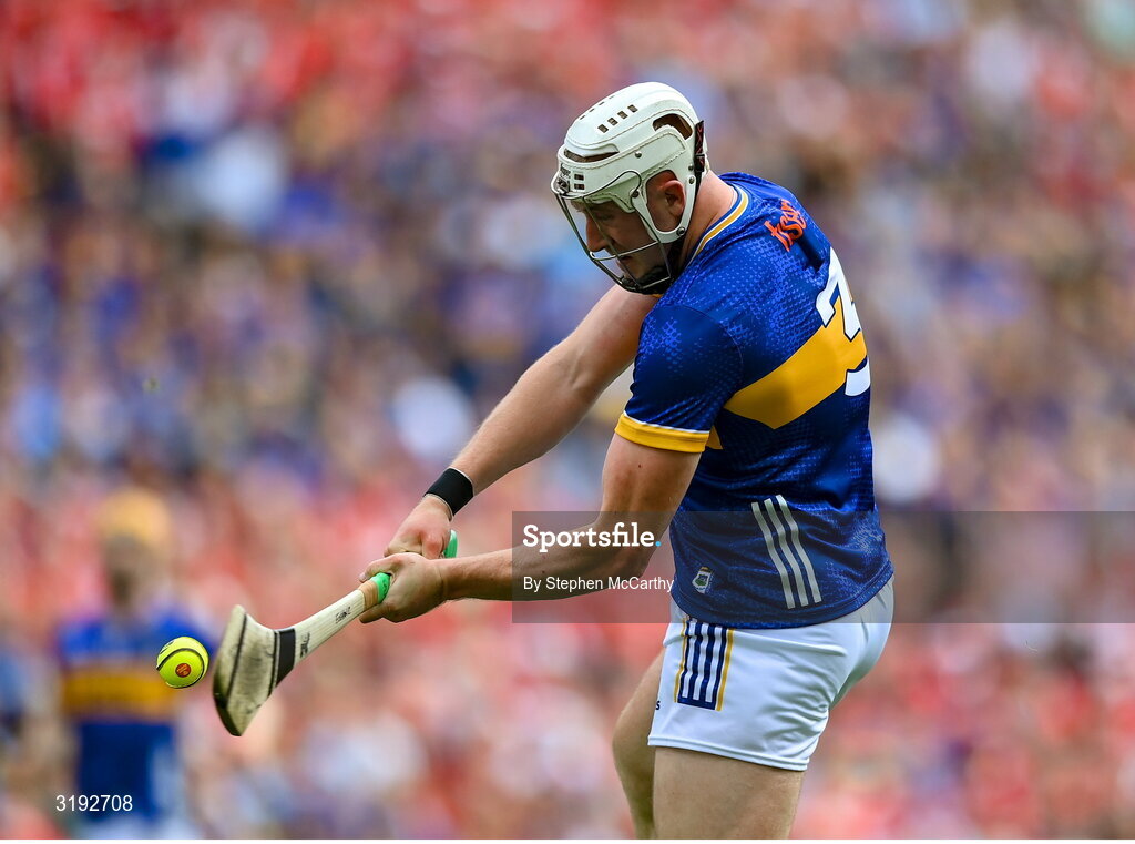 20 July 2025; Eoghan Connolly of Tipperary has a shot on goal during the GAA Hurling All-Ireland Senior Championship final match between Cork and Tipperary at Croke Park in Dublin. Photo by Stephen McCarthy/Sportsfile