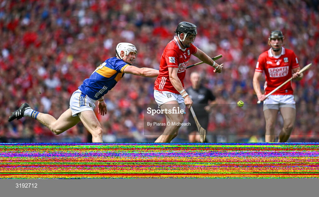 20 July 2025; Darragh Fitzgibbon of Cork in action against Bryan O'Mara of Tipperary during the GAA Hurling All-Ireland Senior Championship final match between Cork and Tipperary at Croke Park in Dublin. Photo by Piaras Ó Mídheach/Sportsfile