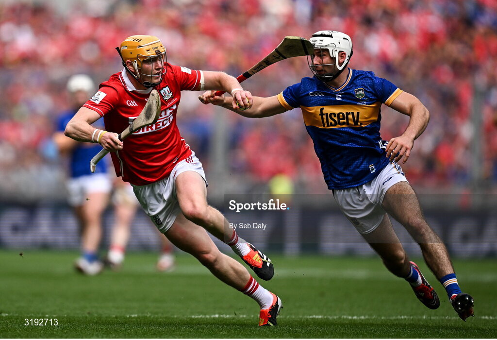 20 July 2025; Shane Barrett of Cork in action against Craig Morgan of Tipperary during the GAA Hurling All-Ireland Senior Championship final match between Cork and Tipperary at Croke Park in Dublin. Photo by Seb Daly/Sportsfile