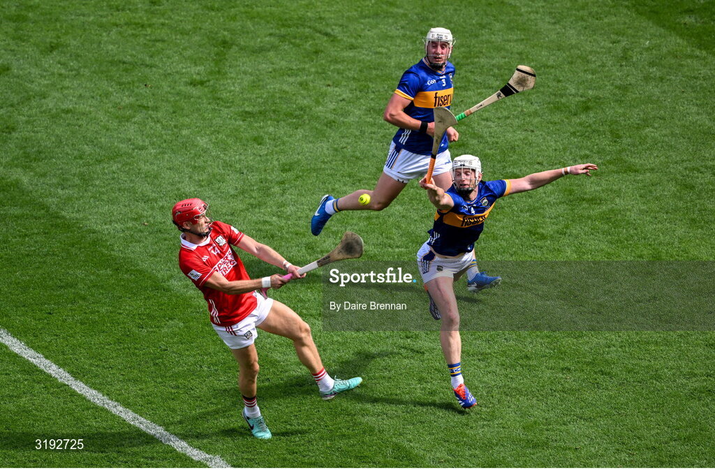 20 July 2025; Yalan Connolly of Cork in action against Michael Breen and Eoghan Connolly of Tipperary during the GAA Hurling All-Ireland Senior Championship final match between Cork and Tipperary at Croke Park in Dublin. Photo by Daire Brennan/Sportsfile