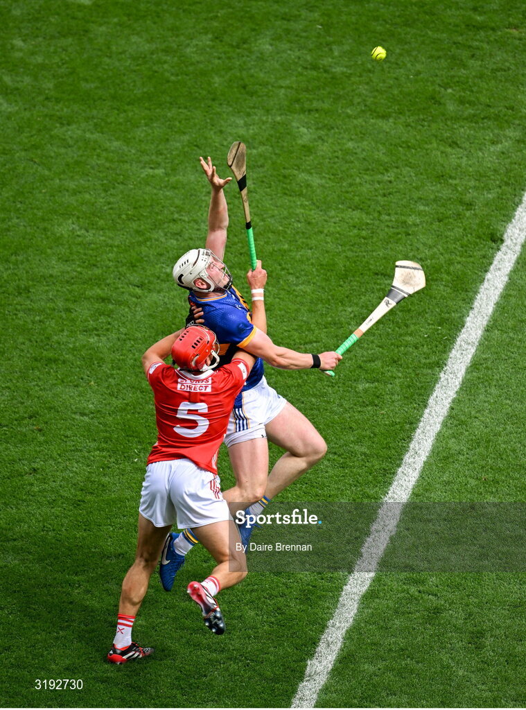20 July 2025; Eoghan Connolly of Tipperary in action against Ciarán Joyce of Cork during the GAA Hurling All-Ireland Senior Championship final match between Cork and Tipperary at Croke Park in Dublin. Photo by Daire Brennan/Sportsfile