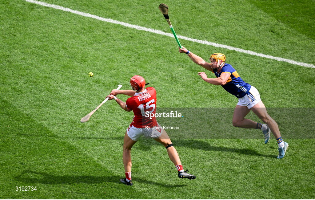 20 July 2025; Brian Hayes of Cork in action against Ronan Maher of Tipperary during the GAA Hurling All-Ireland Senior Championship final match between Cork and Tipperary at Croke Park in Dublin. Photo by Daire Brennan/Sportsfile
