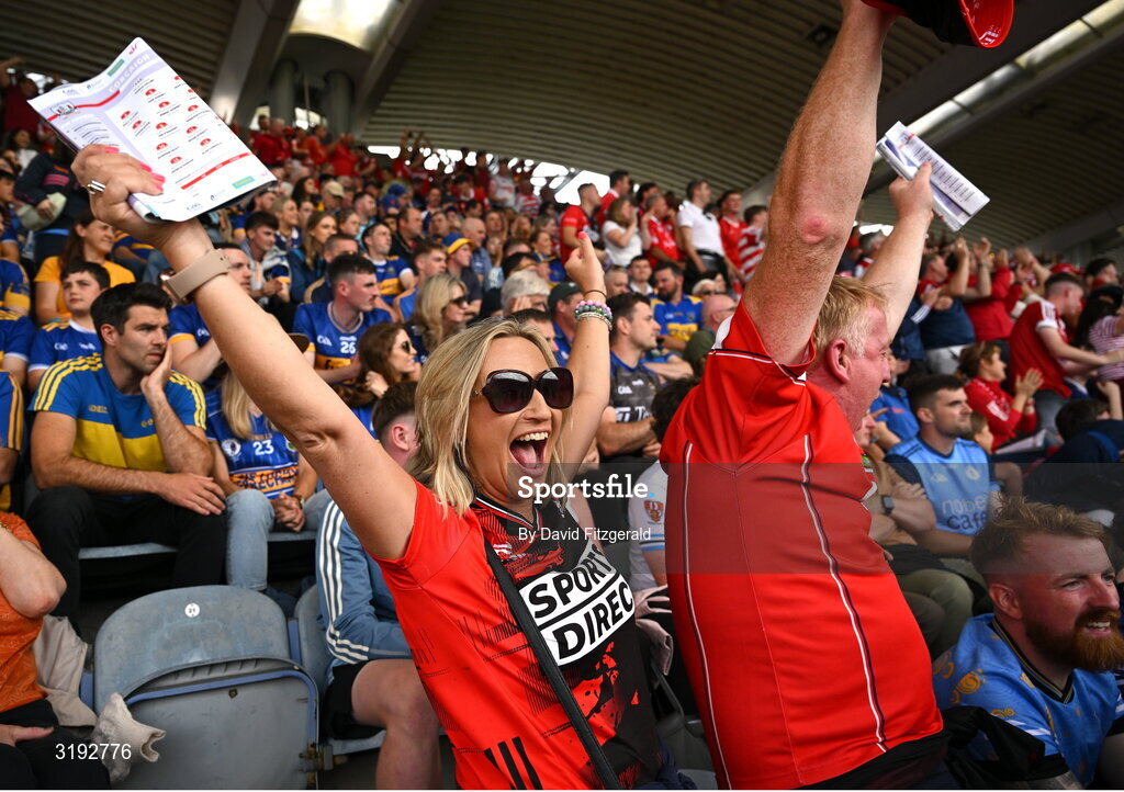 20 July 2025; Cork supporters celebrate their side's first goal during the GAA Hurling All-Ireland Senior Championship final match between Cork and Tipperary at Croke Park in Dublin. Photo by David Fitzgerald/Sportsfile