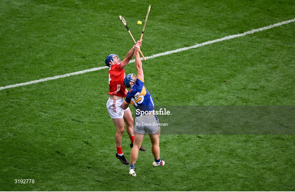 20 July 2025; Jason Forde of Tipperary in action against Seán O'Donoghue of Cork during the GAA Hurling All-Ireland Senior Championship final match between Cork and Tipperary at Croke Park in Dublin. Photo by Daire Brennan/Sportsfile