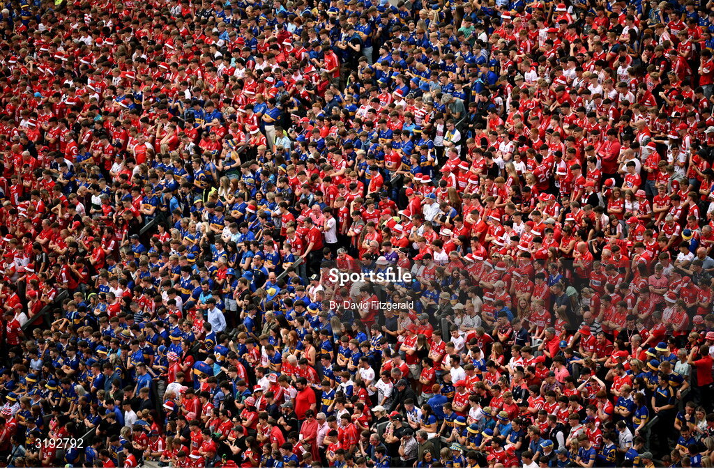 20 July 2025; Cork and Tipperary supporters on Hill 16 during the GAA Hurling All-Ireland Senior Championship final match between Cork and Tipperary at Croke Park in Dublin. Photo by David Fitzgerald/Sportsfile