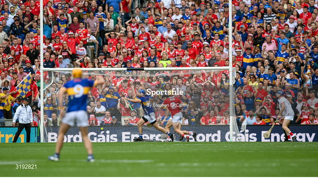 20 July 2025; John McGrath of Tipperary celebrates after scoring his side's first goal during the GAA Hurling All-Ireland Senior Championship final match between Cork and Tipperary at Croke Park in Dublin. Photo by Stephen McCarthy/Sportsfile