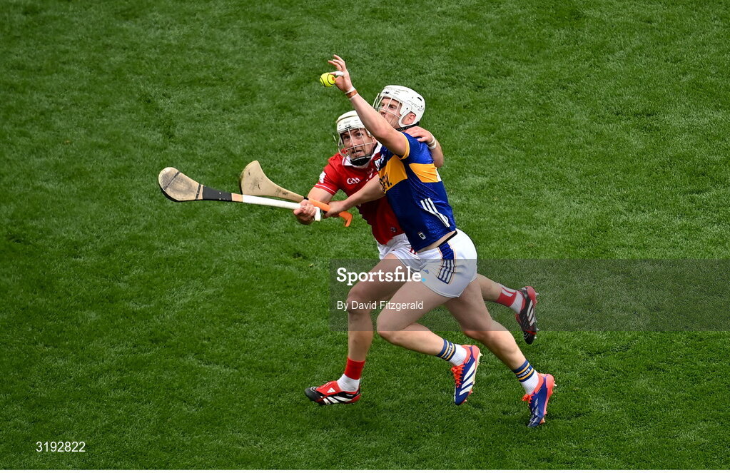 20 July 2025; Michael Breen of Tipperary in action against Patrick Horgan of Cork during the GAA Hurling All-Ireland Senior Championship final match between Cork and Tipperary at Croke Park in Dublin. Photo by David Fitzgerald/Sportsfile
