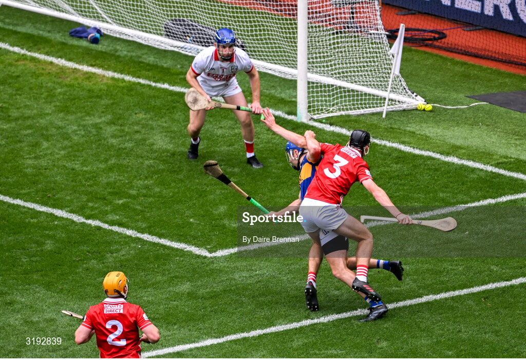 20 July 2025; John McGrath of Tipperary is fouled by Eoin Downey of Cork resulting in a penalty for Tipperary during the GAA Hurling All-Ireland Senior Championship final match between Cork and Tipperary at Croke Park in Dublin. Photo by Daire Brennan/Sportsfile