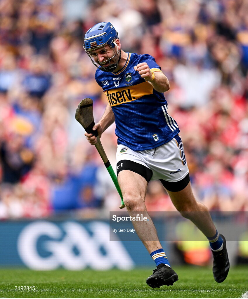 20 July 2025; John McGrath of Tipperary celebrates after scoring his second and his side's third goal during the GAA Hurling All-Ireland Senior Championship final match between Cork and Tipperary at Croke Park in Dublin. Photo by Seb Daly/Sportsfile