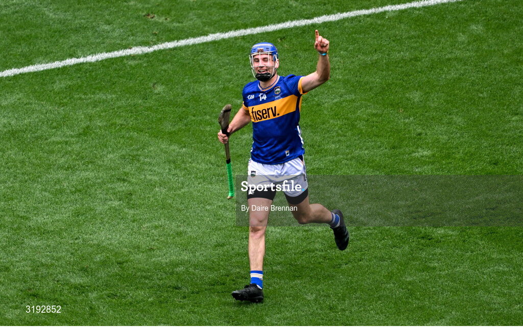 20 July 2025; John McGrath of Tipperary celebrates after scoring his second and his side's third goal during the GAA Hurling All-Ireland Senior Championship final match between Cork and Tipperary at Croke Park in Dublin. Photo by Daire Brennan/Sportsfile