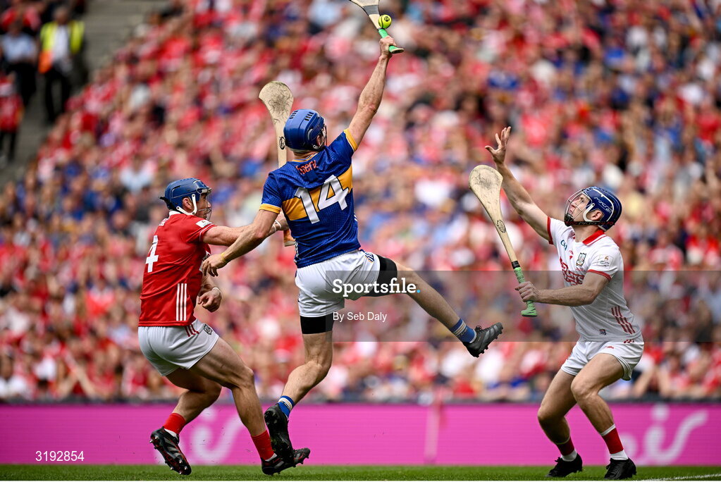 20 July 2025; John McGrath of Tipperary scores his second and his side's third goal past Cork goalkeeper Patrick Collins and Seán O'Donoghue of Cork during the GAA Hurling All-Ireland Senior Championship final match between Cork and Tipperary at Croke Park in Dublin. Photo by Seb Daly/Sportsfile