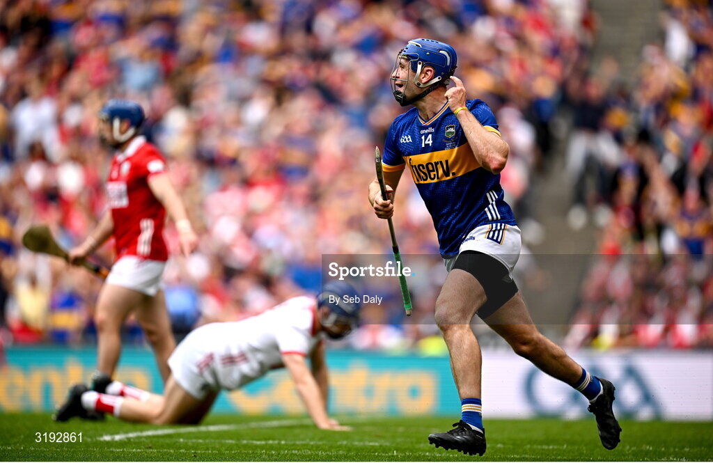20 July 2025; John McGrath of Tipperary celebrates after scoring his second and his side's third goal during the GAA Hurling All-Ireland Senior Championship final match between Cork and Tipperary at Croke Park in Dublin. Photo by Seb Daly/Sportsfile