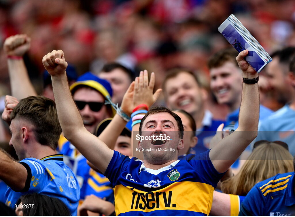 20 July 2025; Tipperary supporters celebrate during the GAA Hurling All-Ireland Senior Championship final match between Cork and Tipperary at Croke Park in Dublin. Photo by Stephen McCarthy/Sportsfile