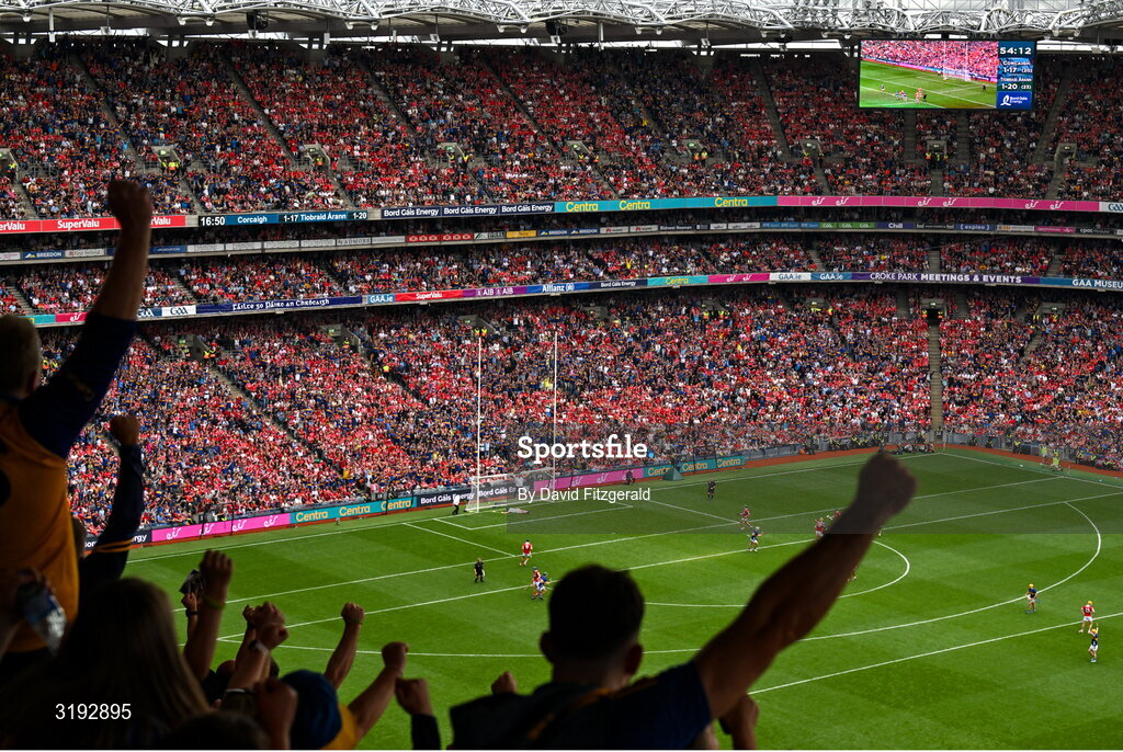 20 July 2025; Tipperary players and supporters celebrate their side's second goal scored by Darragh McCarthy during the GAA Hurling All-Ireland Senior Championship final match between Cork and Tipperary at Croke Park in Dublin. Photo by David Fitzgerald/Sportsfile