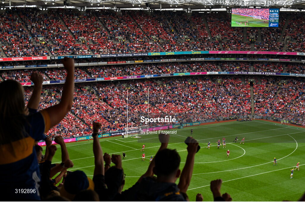20 July 2025; Tipperary players and supporters celebrate their side's second goal scored by Darragh McCarthy during the GAA Hurling All-Ireland Senior Championship final match between Cork and Tipperary at Croke Park in Dublin. Photo by David Fitzgerald/Sportsfile