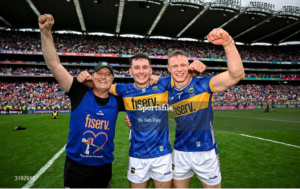 20 July 2025; Tipperary manager Liam Cahill, left, celebrates with Craig Morgan and Bryan O'Mara after the GAA Hurling All-Ireland Senior Championship final match between Cork and Tipperary at Croke Park in Dublin. Photo by Seb Daly/Sportsfile