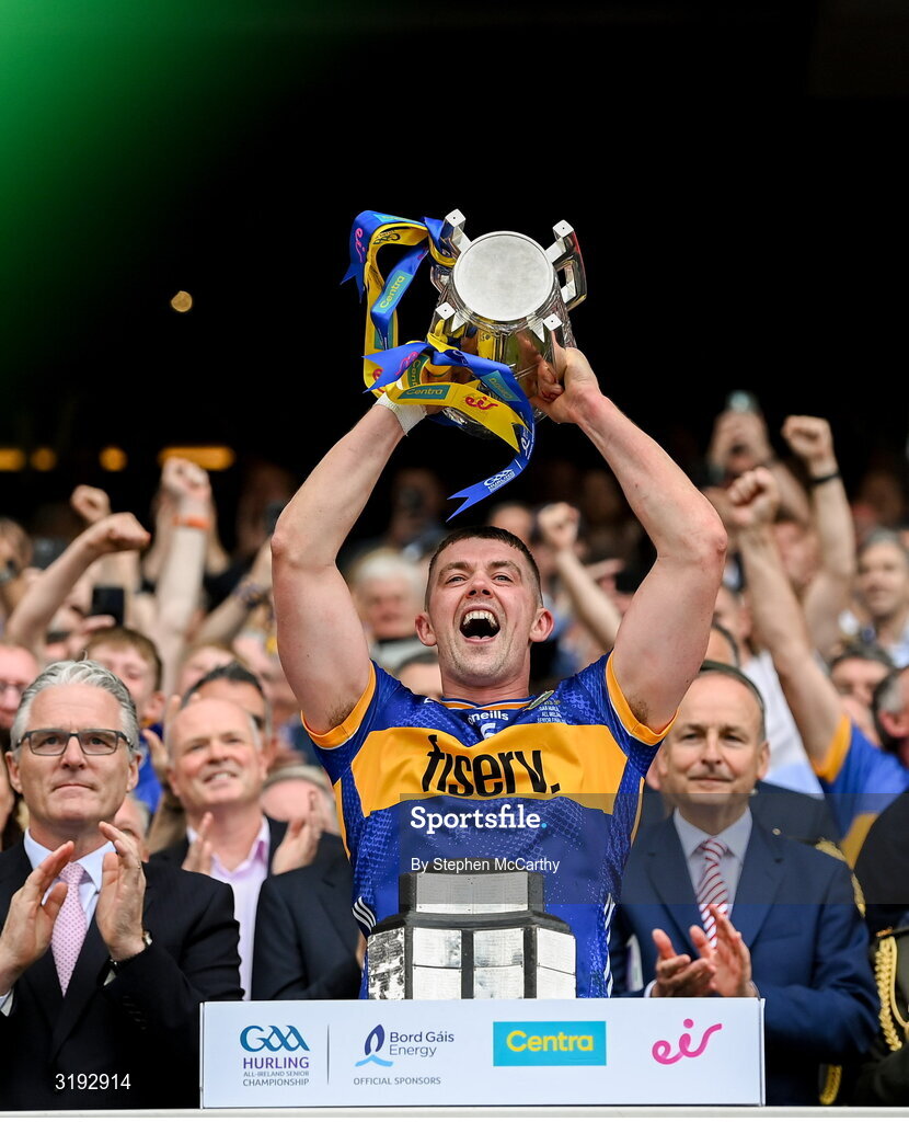 20 July 2025; Ronan Maher of Tipperary lifts the Liam MacCarthy Cup after his side's victory in the GAA Hurling All-Ireland Senior Championship final match between Cork and Tipperary at Croke Park in Dublin. Photo by Stephen McCarthy/Sportsfile