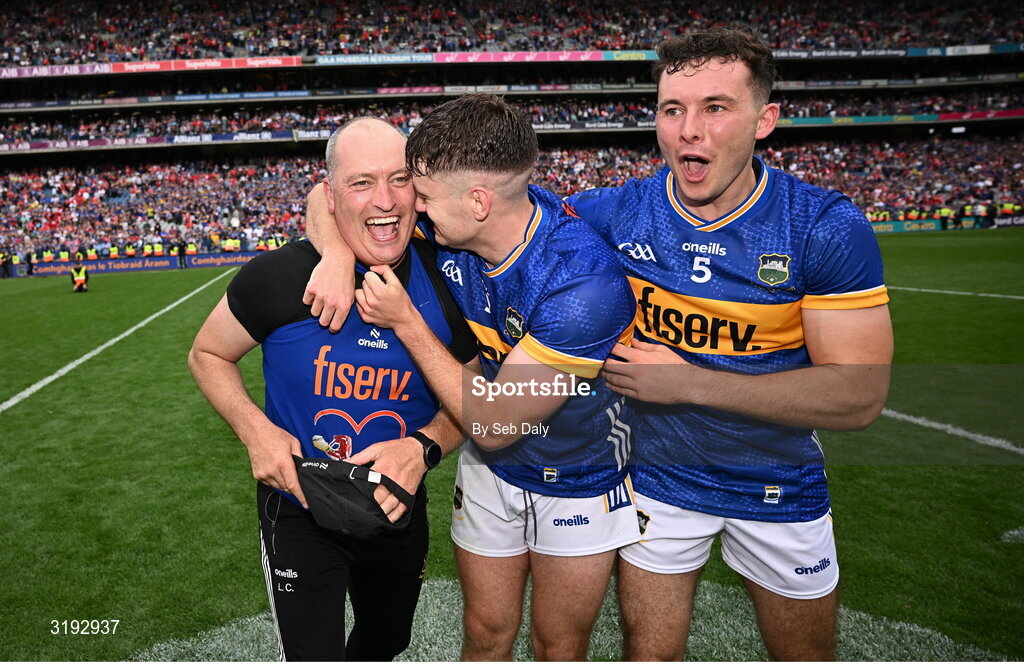 20 July 2025; Tipperary manager Liam Cahill celebrates with Conor Stakelum and Craig Morgan after the GAA Hurling All-Ireland Senior Championship final match between Cork and Tipperary at Croke Park in Dublin. Photo by Seb Daly/Sportsfile