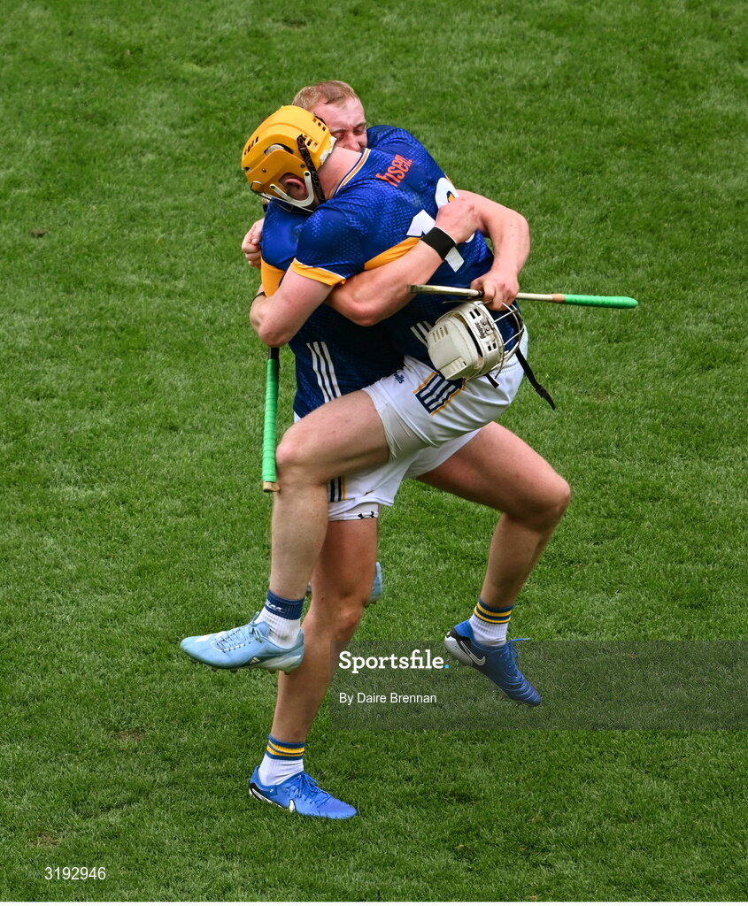 20 July 2025; Eoghan Connolly, left, and Jake Morris of Tipperary celebrate after the GAA Hurling All-Ireland Senior Championship final match between Cork and Tipperary at Croke Park in Dublin. Photo by Daire Brennan/Sportsfile