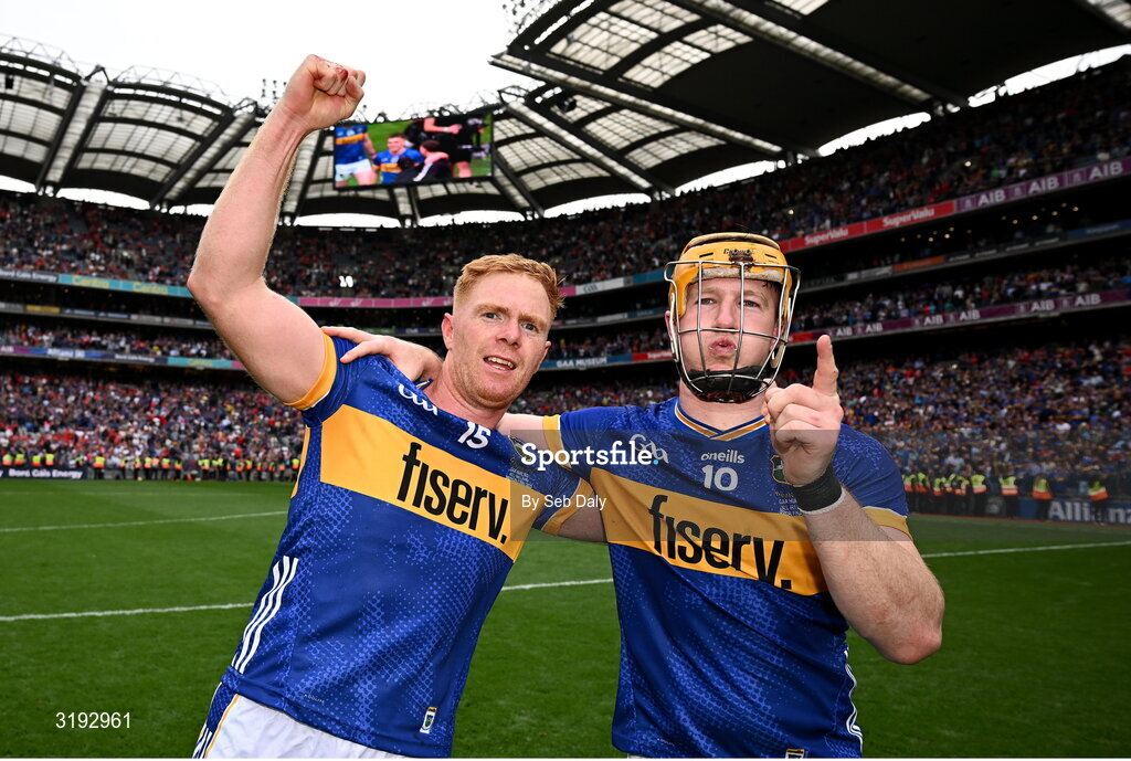 20 July 2025; Tipperary players, from left, Jason Forde and Jake Morris celebrate after their side's victory in the GAA Hurling All-Ireland Senior Championship final match between Cork and Tipperary at Croke Park in Dublin. Photo by Seb Daly/Sportsfile