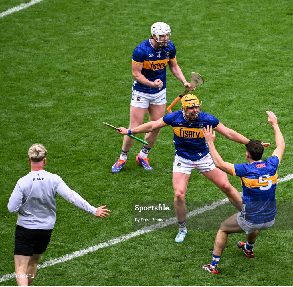 20 July 2025; Tipperary players, from left, Michael Breen, Ronan Maher, centre, and Craig Morgan celebrate after the GAA Hurling All-Ireland Senior Championship final match between Cork and Tipperary at Croke Park in Dublin. Photo by Daire Brennan/Sportsfile