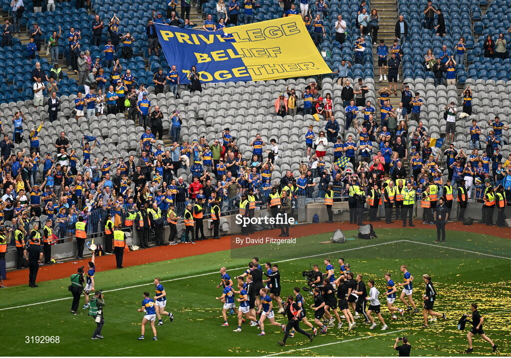 20 July 2025; Tipperary players celebrate with the Liam MacCarthy Cup after their side's victory in the GAA Hurling All-Ireland Senior Championship final match between Cork and Tipperary at Croke Park in Dublin. Photo by David Fitzgerald/Sportsfile