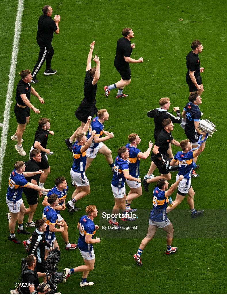 20 July 2025; Tipperary players including John McGrath, 14, run toward Hill 16 with the Liam MacCarthy Cup after their side's victory in the GAA Hurling All-Ireland Senior Championship final match between Cork and Tipperary at Croke Park in Dublin. Photo by David Fitzgerald/Sportsfile