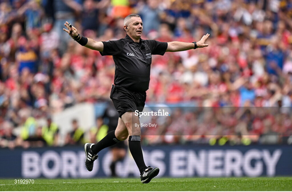 20 July 2025; Referee Liam Gordon signals a free during the GAA Hurling All-Ireland Senior Championship final match between Cork and Tipperary at Croke Park in Dublin. Photo by Seb Daly/Sportsfile