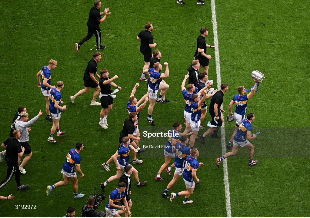 20 July 2025; Tipperary players including John McGrath, 14, run toward Hill 16 with the Liam MacCarthy Cup after their side's victory in the GAA Hurling All-Ireland Senior Championship final match between Cork and Tipperary at Croke Park in Dublin. Photo by David Fitzgerald/Sportsfile