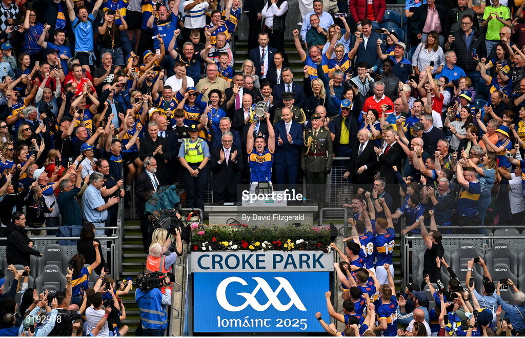 20 July 2025; Tipperary captain Ronan Maher lifts the Liam MacCarthy cup after his side's victory in the GAA Hurling All-Ireland Senior Championship final match between Cork and Tipperary at Croke Park in Dublin. Photo by David Fitzgerald/Sportsfile