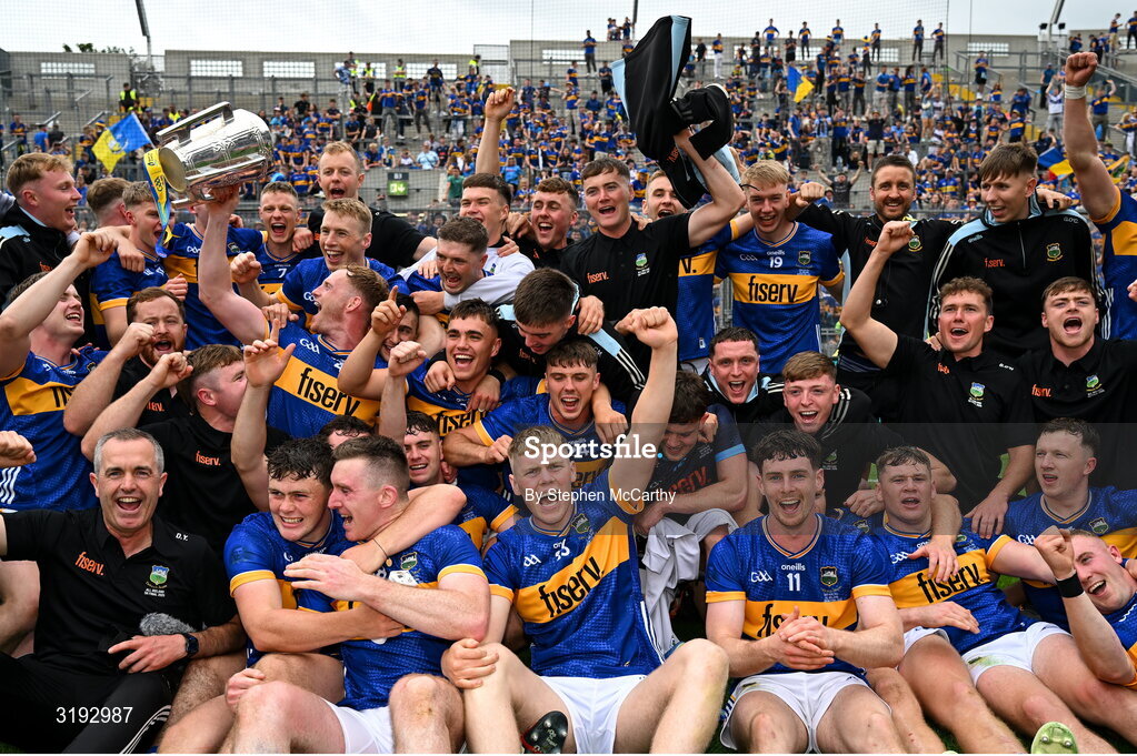 20 July 2025; Tipperary players and staff celebrate with the Liam MacCarthy Cup after their side's victory in the GAA Hurling All-Ireland Senior Championship final match between Cork and Tipperary at Croke Park in Dublin. Photo by Stephen McCarthy/Sportsfile