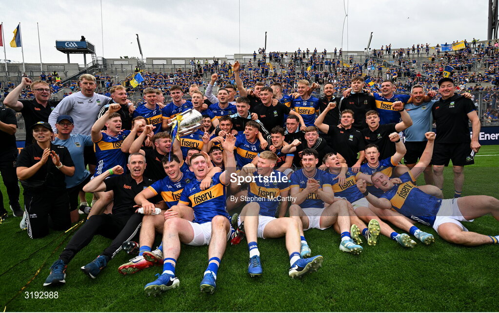20 July 2025; Tipperary players and staff celebrate with the Liam MacCarthy Cup after their side's victory in the GAA Hurling All-Ireland Senior Championship final match between Cork and Tipperary at Croke Park in Dublin. Photo by Stephen McCarthy/Sportsfile