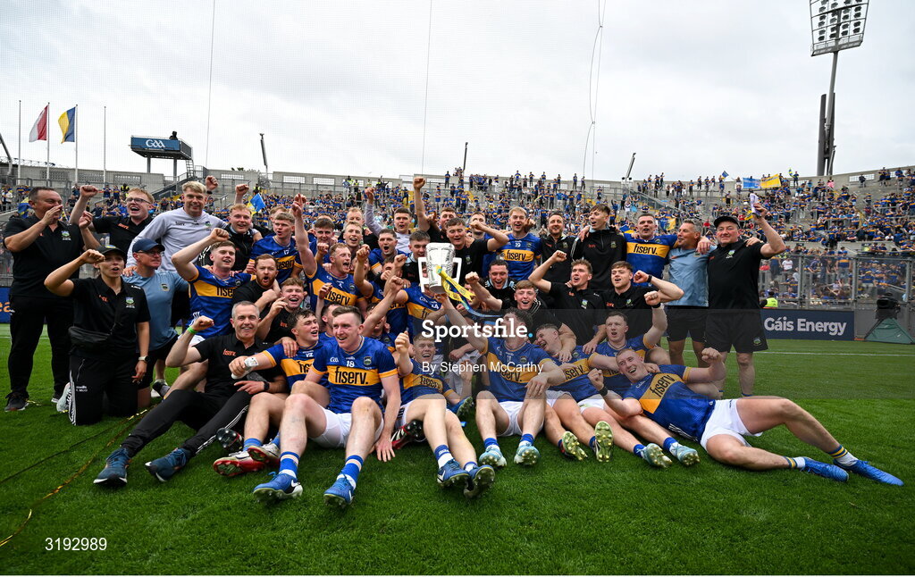 20 July 2025; Tipperary players and staff celebrate with the Liam MacCarthy Cup after their side's victory in the GAA Hurling All-Ireland Senior Championship final match between Cork and Tipperary at Croke Park in Dublin. Photo by Stephen McCarthy/Sportsfile