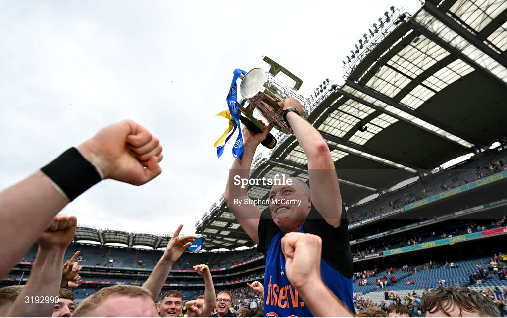 20 July 2025; Tipperary manager Liam Cahill celebrates with the Liam MacCarthy Cup after his side's victory in the GAA Hurling All-Ireland Senior Championship final match between Cork and Tipperary at Croke Park in Dublin. Photo by Stephen McCarthy/Sportsfile