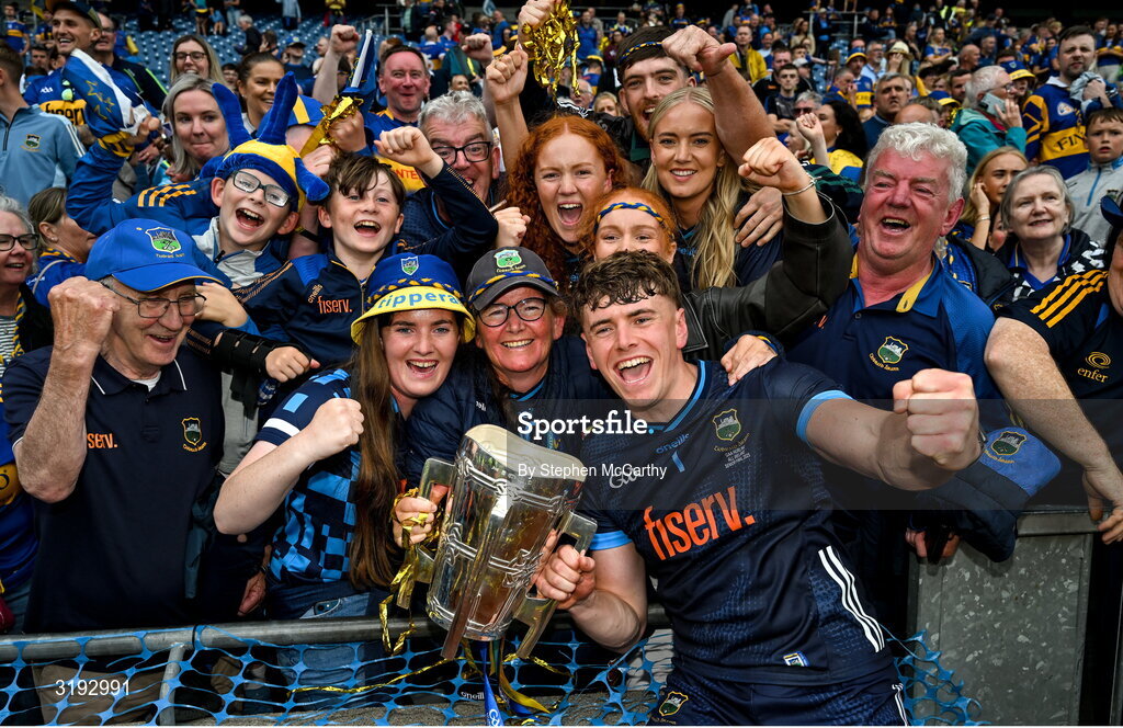 20 July 2025; Tipperary goalkeeper Rhys Shelly celebrates with his family and the Liam MacCarthy Cup after his side's victory in the GAA Hurling All-Ireland Senior Championship final match between Cork and Tipperary at Croke Park in Dublin. Photo by Stephen McCarthy/Sportsfile