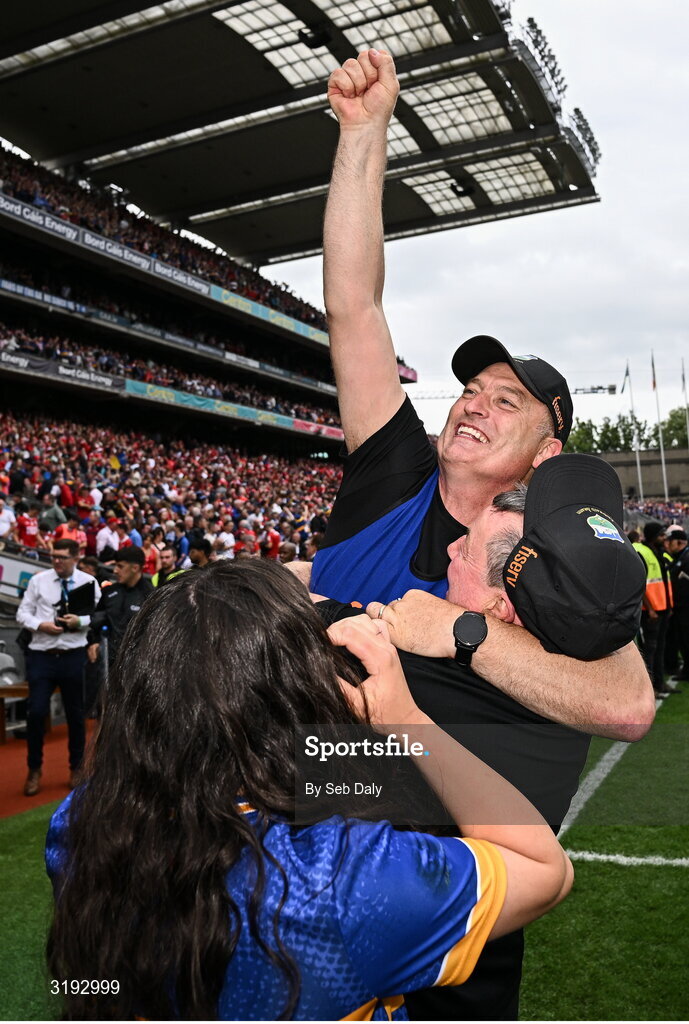 20 July 2025; Tipperary manager Liam Cahill celebrates after his side's victory in the GAA Hurling All-Ireland Senior Championship final match between Cork and Tipperary at Croke Park in Dublin. Photo by Seb Daly/Sportsfile