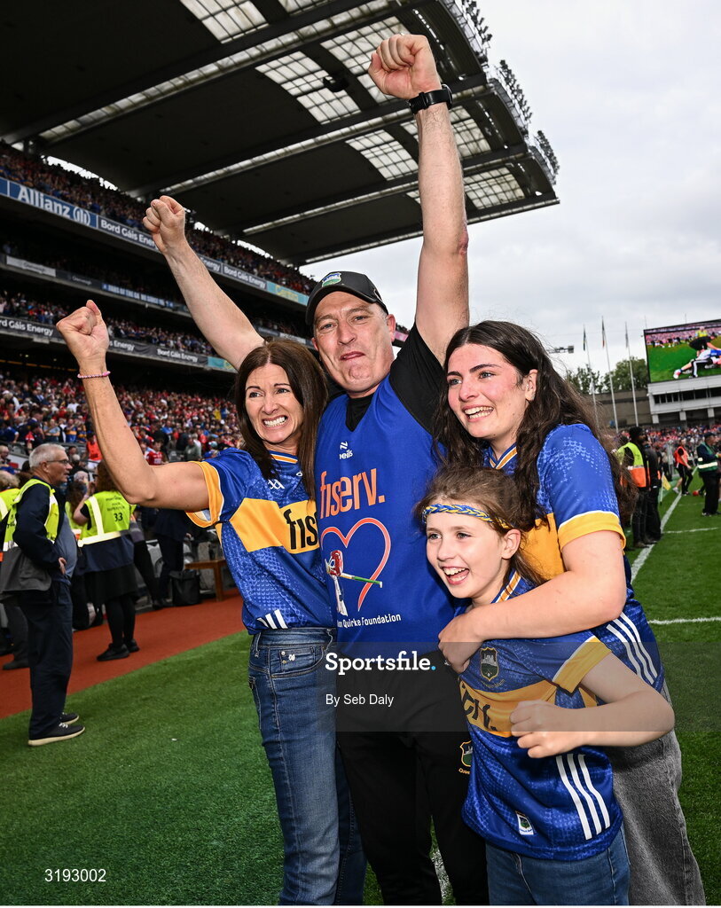 20 July 2025; Tipperary manager Liam Cahill celebrates with his wife Eimear and daughters Emily and Roisin after the GAA Hurling All-Ireland Senior Championship final match between Cork and Tipperary at Croke Park in Dublin. Photo by Seb Daly/Sportsfile