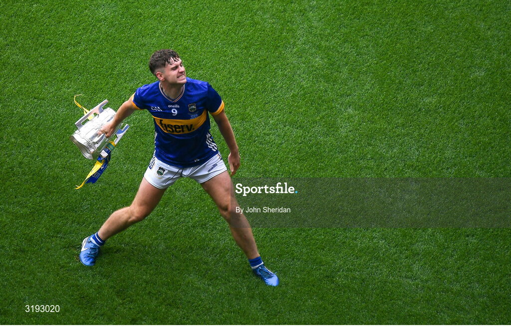 20 July 2025; Conor Stakelum of Tipperary celebrates with the Liam McCarthy cup after winning the GAA Hurling All-Ireland Senior Championship final match between Cork and Tipperary at Croke Park in Dublin. Photo by John Sheridan/Sportsfile