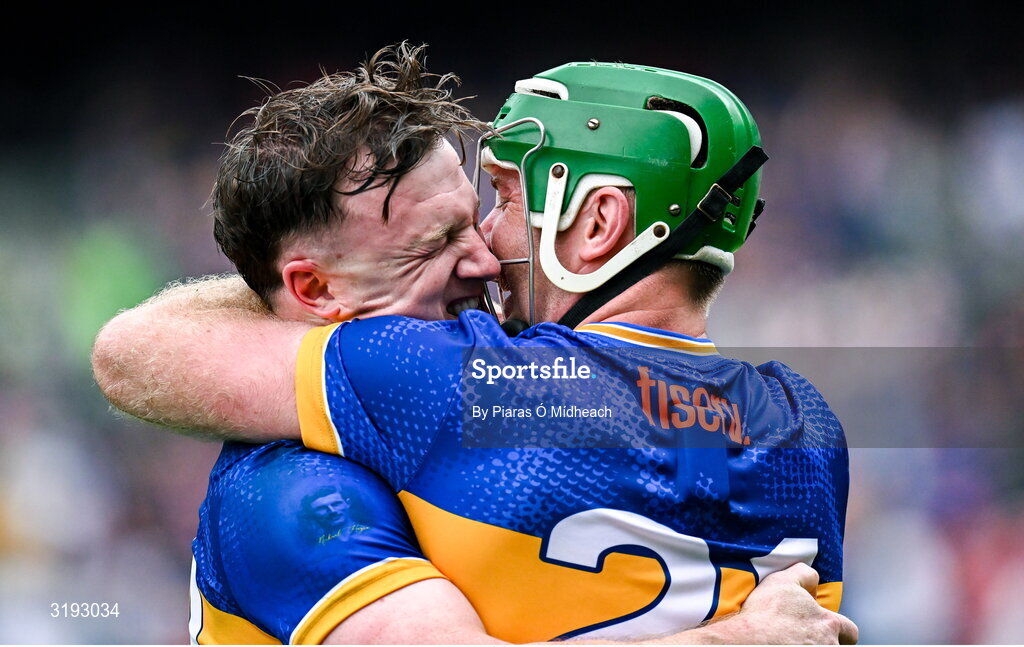 20 July 2025; Tipperary players Jake Morris, left, and Noel McGrath celebrate after their side's victory in the GAA Hurling All-Ireland Senior Championship final match between Cork and Tipperary at Croke Park in Dublin. Photo by Piaras Ó Mídheach/Sportsfile