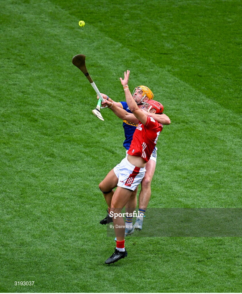 20 July 2025; Brian Hayes of Cork in action against Ronan Maher of Tipperary during the GAA Hurling All-Ireland Senior Championship final match between Cork and Tipperary at Croke Park in Dublin. Photo by Daire Brennan/Sportsfile