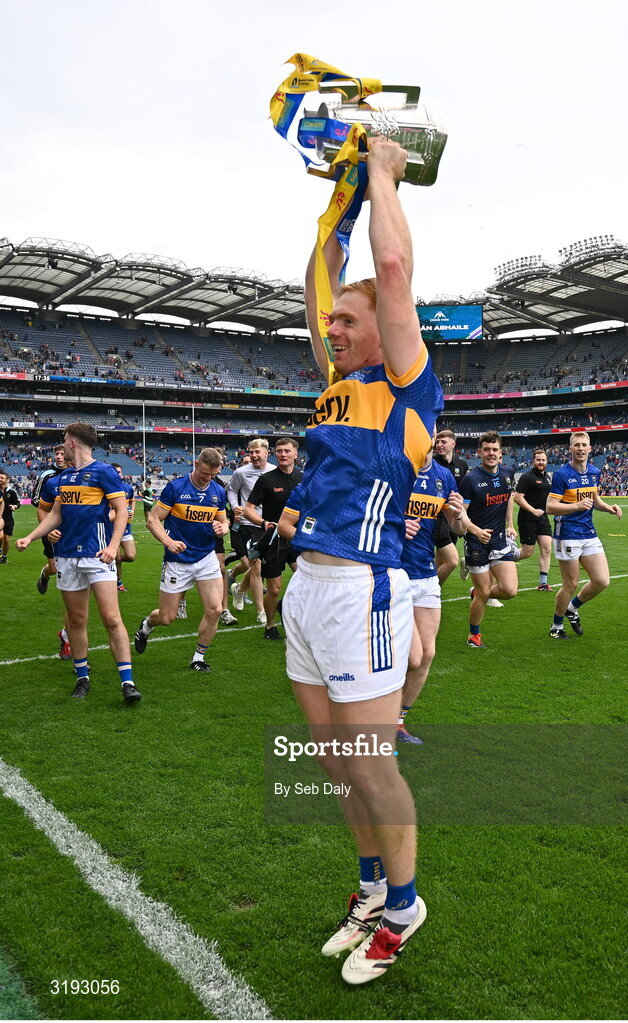 20 July 2025; Jason Forde of Tipperary celebrates with the Liam MacCarthy cup after his side's victory in the GAA Hurling All-Ireland Senior Championship final match between Cork and Tipperary at Croke Park in Dublin. Photo by Seb Daly/Sportsfile