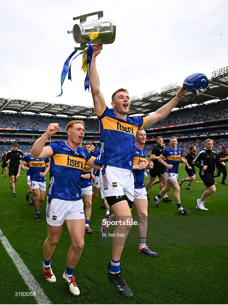 20 July 2025; John McGrath of Tipperary, centre, celebrates with the Liam MacCarthy cup alongside teammate Jason Forde after the GAA Hurling All-Ireland Senior Championship final match between Cork and Tipperary at Croke Park in Dublin. Photo by Seb Daly/Sportsfile