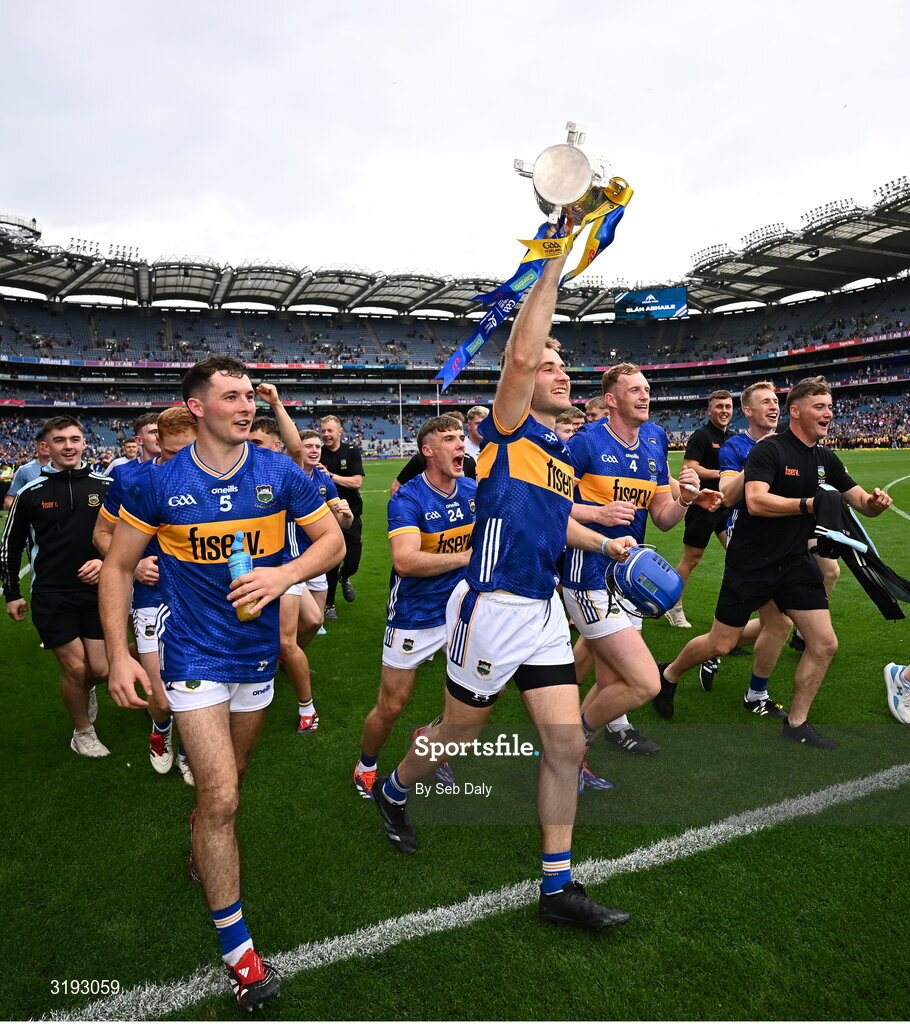 20 July 2025; John McGrath of Tipperary celebrates with the Liam MacCarthy cup and teammates after their side's victory in the GAA Hurling All-Ireland Senior Championship final match between Cork and Tipperary at Croke Park in Dublin. Photo by Seb Daly/Sportsfile