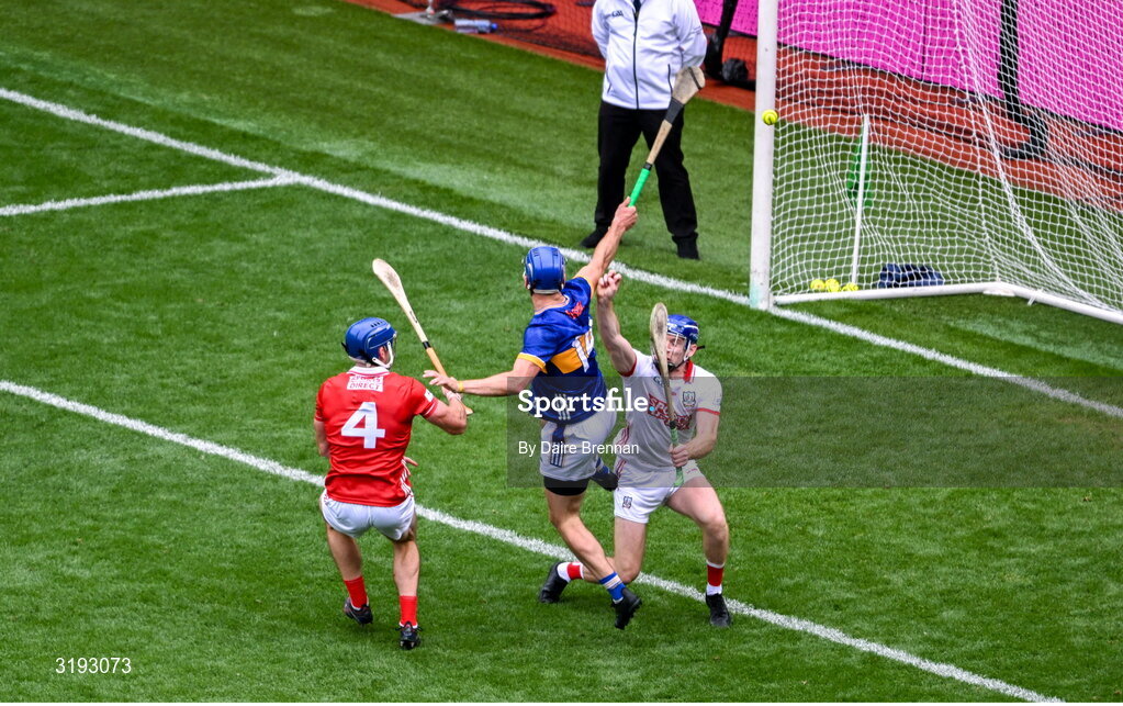20 July 2025; John McGrath of Tipperary scores his side's third goal past Cork goalkeeper Patrick Collins during the GAA Hurling All-Ireland Senior Championship final match between Cork and Tipperary at Croke Park in Dublin. Photo by Daire Brennan/Sportsfile