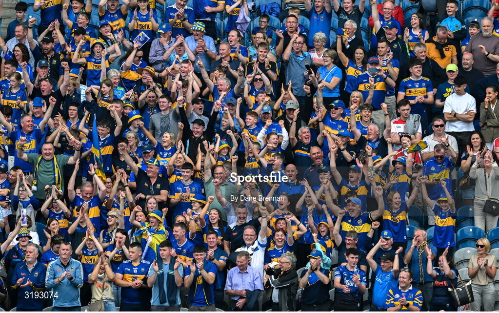 20 July 2025; Tipperary supporters celebrate in the Cusack Stand after the GAA Hurling All-Ireland Senior Championship final match between Cork and Tipperary at Croke Park in Dublin. Photo by Daire Brennan/Sportsfile