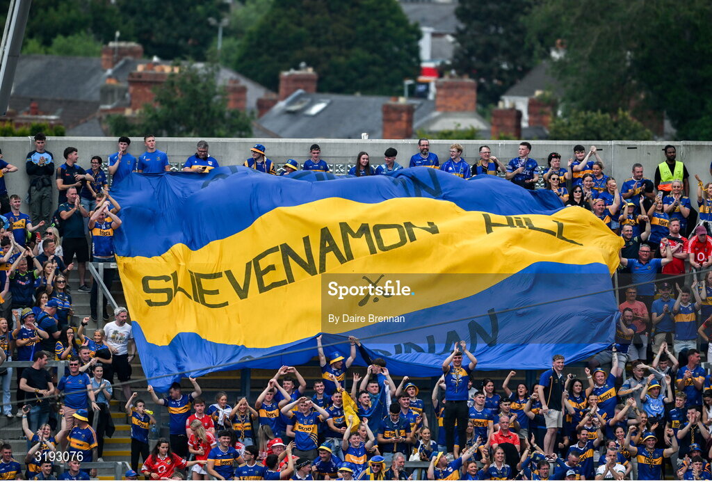 20 July 2025; Tipperary supporters celebrate on Hill 16 after the GAA Hurling All-Ireland Senior Championship final match between Cork and Tipperary at Croke Park in Dublin. Photo by Daire Brennan/Sportsfile