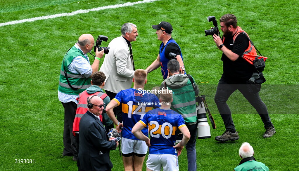 20 July 2025; Tipperary manager Liam Cahill is congratulated by former manager Liam Sheedy after the GAA Hurling All-Ireland Senior Championship final match between Cork and Tipperary at Croke Park in Dublin. Photo by Daire Brennan/Sportsfile